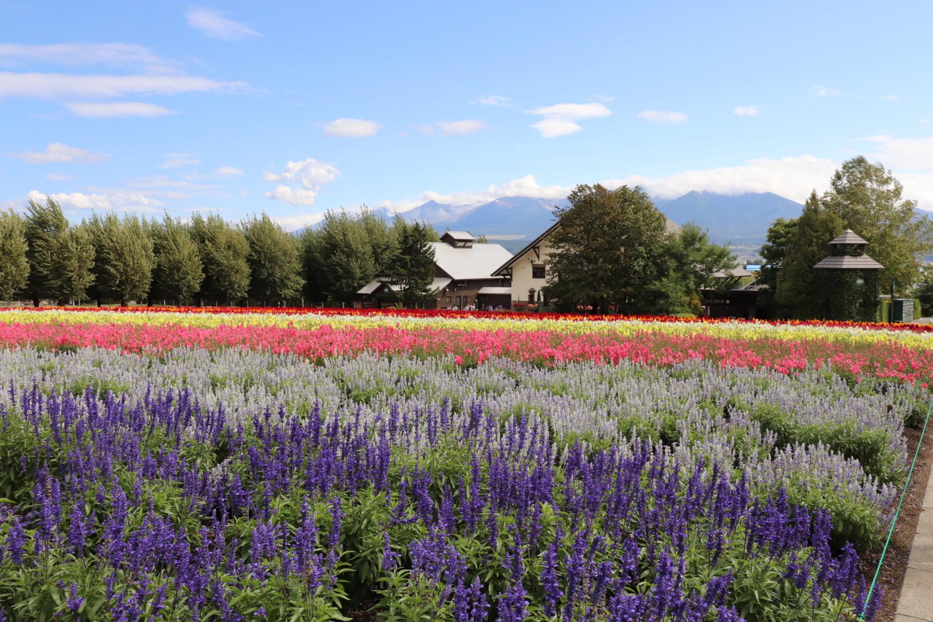 色違いのサルビアと遠くに見える富良野岳!北海道の雄大な自然に圧倒されます!